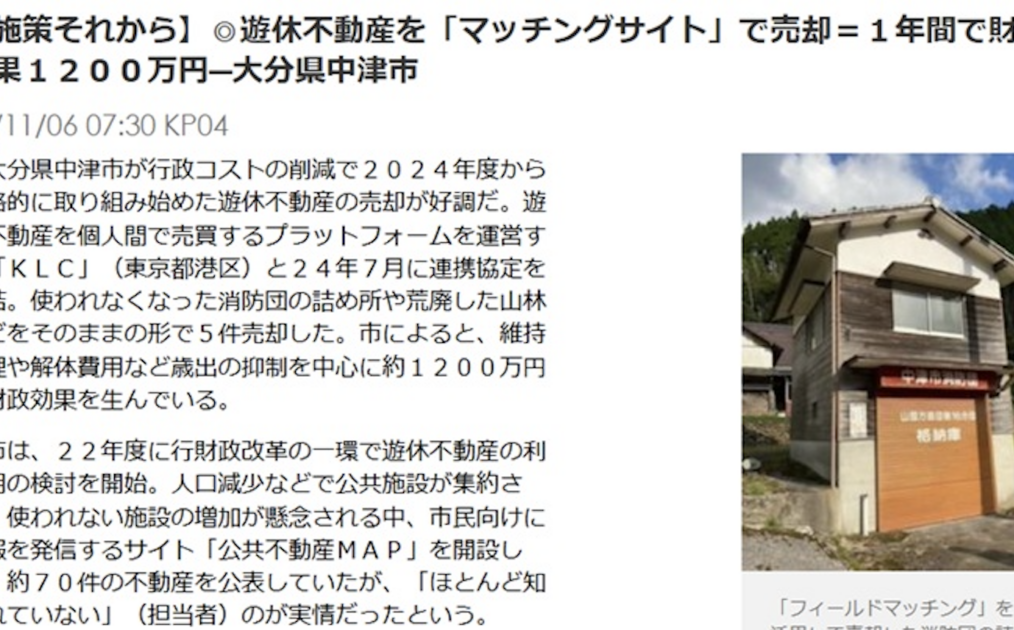 1年間で財政効果1200万円=遊休不動産をマッチングサイトで売却/時事通信社「iJAMP」に大分県中津市と当社の取り組みが取り上げられました。